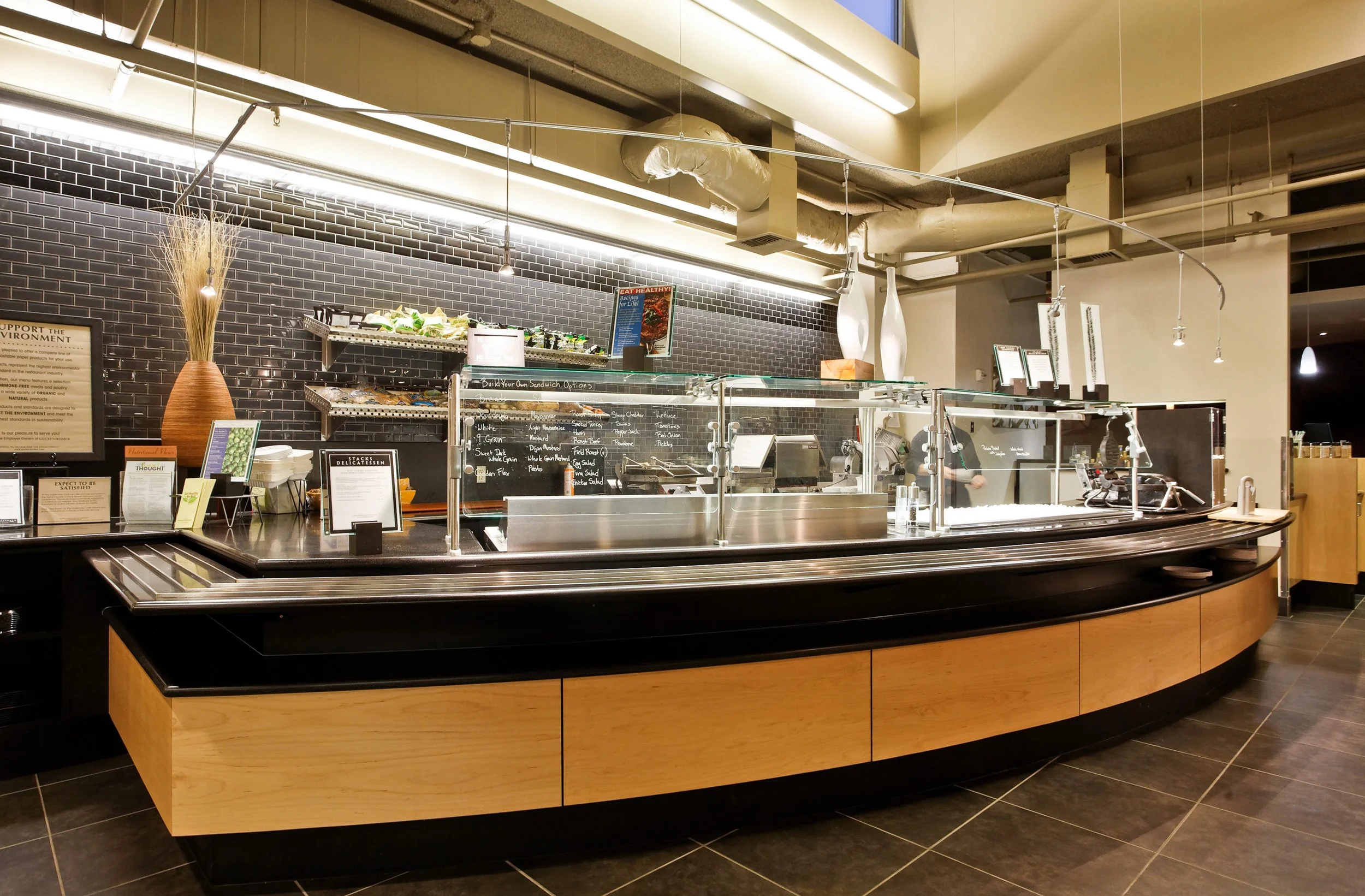 This Café was designed as an employee destination for relaxation, rejuvenation, and connection. The existing café was expanded to feature a specialty coffee lounge, an open-flame gas grill, new entrée stations, and exciting entertainment amenities. A fresh, neutral palette was developed to provide supportive contrast to the appetizing colors of the Café’s main attraction – its deliciously prepared meals. Large company gatherings, sporting events, and everyday dining are enhanced with the aesthetic appeal of creative materials, as seen in the maple ceiling and wall feature, the color-changing sculpted walls, the crisp wall tile, the exposed ceilings, and the open floor plan overlooking the water.